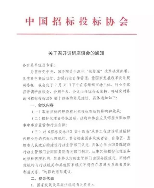 8月8日消息:7月31日,受國家發改委法規司委托,中國招標投標協會將組織市場主體、業內專家學者,就《招標投標法》第十四條關于工程招標代理機構資質管理的條款修訂收集意見。