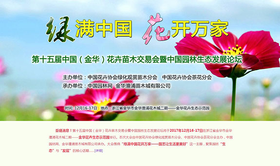 重磅消息!第十五屆中國(金華)花卉苗木交易會暨中國園林生態發展論壇將于2017年12月16-17日在浙江省金華市金華澧浦花木城二期——金華花卉生態示范園舉行。本次大會由中國花卉協會綠化觀賞苗木分會、中國花卉協會茶花分會主辦,中國園林網、金華澧浦苗木城有限公司承辦。