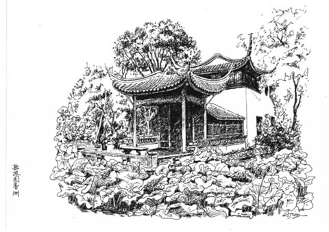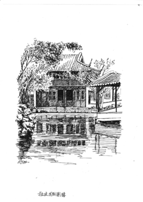 倒影樓(拜文揖沈之齋):位于拙政園西花園東北隅,臨水而建,樓高二層,上下各名,坐北朝南,面闊三間,三面繞回廊。樓上倚窗可居高臨下觀水中倒影,站在樓東側水廊上又可看樓影倒映水中,故名。舊時在此可眺望園外油菜花田,故曾稱“菜花樓”。倒影樓與“宜兩亭”遙遙相對,互為對景。樓下稱“拜文揖沈之齋”,齋內東西兩壁上嵌有明代文徵明、沈周半身像和傳記,以及文徵明撰書的《王氏拙政園記》和張履謙《補園記》等書條石,為紀念兩位著名文人,故名。