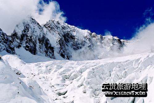 它的形狀為不規則棱柱體,感覺是從山頂向下緩緩爬行戛然而止,形成一片片冰塔林,真可謂“堆瓊積玉”。由于白天氣溫升高,覆蓋表面的膨松白色積雪融化,這些冰塔呈現出淡淡的綠色瑩光,形成“綠雪奇峰”景觀。