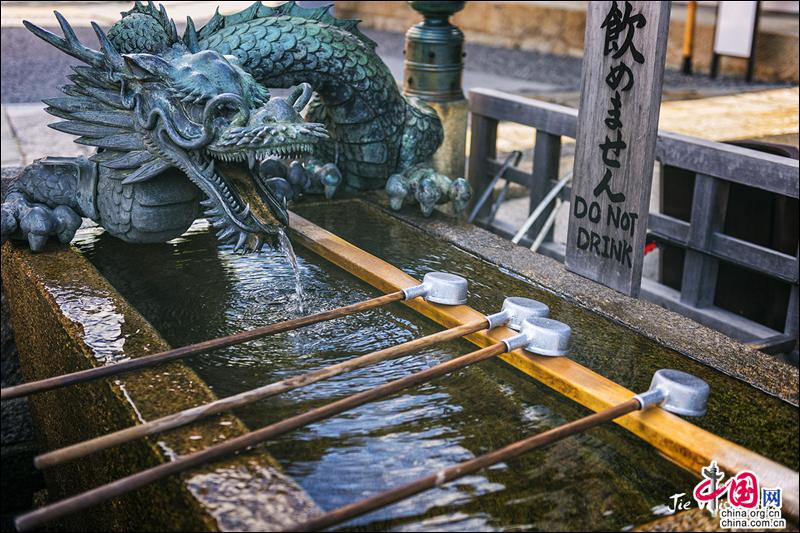 清水寺因寺中清水而得名,順著奧院的石階而下便是音羽瀑布,清泉一分為三,分別代表長壽,健康,美麗,被視為具有神奇力量,游客路經此地一定會來喝上一口水,據說可預防疾病及災厄。