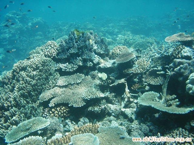 在大堡礁群中,色彩斑斕的珊瑚礁有紅色的、粉色的、綠色的、紫色的、黃色的。它們的形狀千姿百態(tài),有的似開屏的孔雀;有的像雪中紅梅;有的渾圓似蘑菇,有的纖細如鹿茸;有的白如飛霜,有的綠似翡翠;有的像靈芝……未可名狀,形成一幅千姿百態(tài)、奇特壯觀的天然藝術(shù)圖畫。