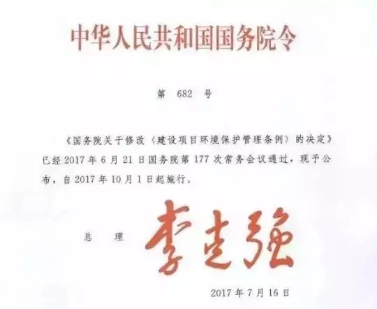 《國務院關于修改〈建設項目環境保護管理條例〉的決定》已經2017年6月21日國務院第177次常務會議通過,現予公布,自2017年10月1日起施行。