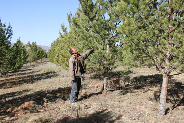 由于山上不能直接育樹苗,齊軍祥每年都要在自家耕地里先育苗,再將育好的苗移栽到山上,而那些種不完的樹苗就對外銷售,獲取一些收入。2004年,齊軍祥已經培育了30多畝松樹和柏樹樹苗。當年,除了用于齊山栽植和對外銷售,他家耕地里還剩下10多畝樹苗,齊軍祥任其繼續生長著。