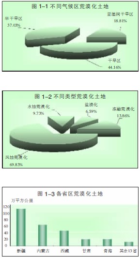 截至2009年底,全國(guó)荒漠化土地總面積262.37萬平方公里,占國(guó)土總面積的27.33%,分布于北京、天津、河北、山西、內(nèi)蒙古、遼寧、吉林、山東、河南、海南、四川、云南、西藏、陜西、甘肅、青海、寧夏、新疆18個(gè)省(自治區(qū)、直轄市)的508個(gè)縣(旗、區(qū))。