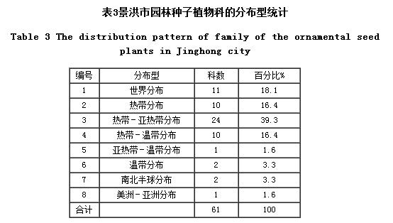 科的分布型是科內植物自然分布地域的總稱[2]。景洪城市園林植物科的分布型以熱帶性成分為優勢,有44科,占72.2%,其它分布型的科較少(表3),這是符合景洪的生態環境特點的。