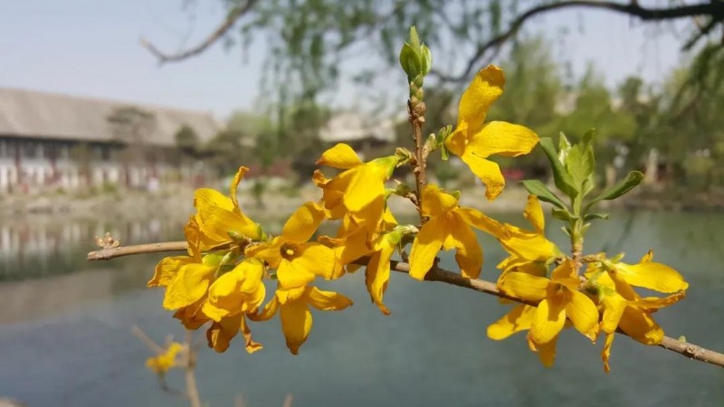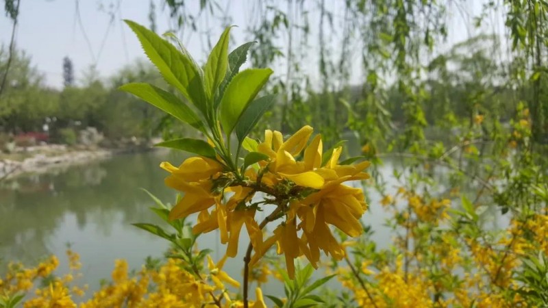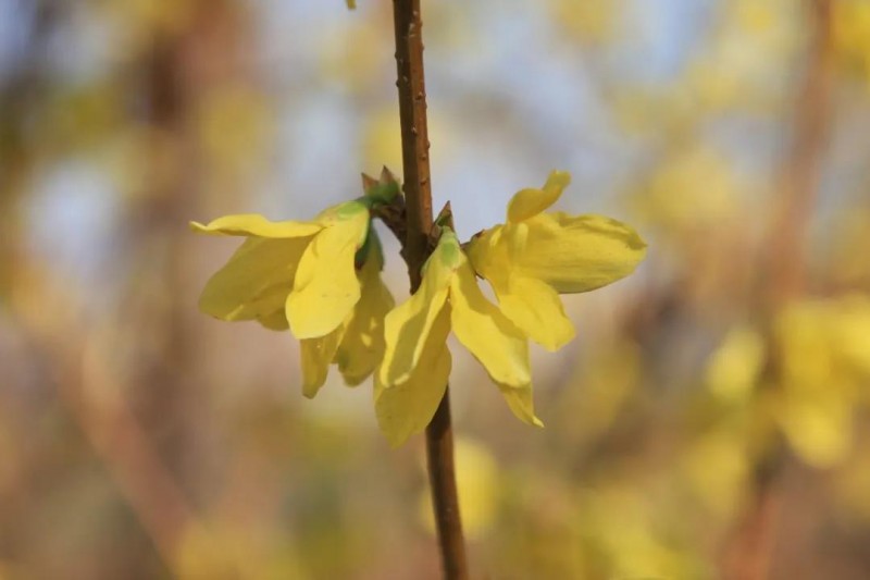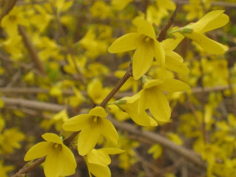 又叫黃金條、黃壽丹、黃綬帶和一串金,株高可達3米,落葉灌木,花期在3-4月,果期在7-9月,是木樨科連翹屬植物。在早春的時候最先開花的是葉,花開香氣淡艷,滿枝金黃,艷麗可愛,是早春優良觀花灌木呢。