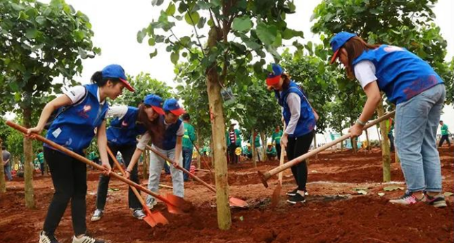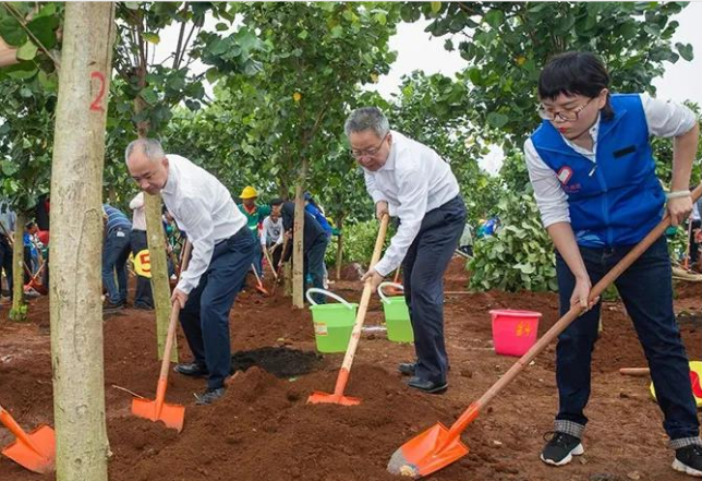 劉賜貴接連種下銀葉、黃槿、紅花玉蕊等海南鄉(xiāng)土喬木。大家一起揮鍬挖坑、扶正樹苗、填土夯苗、拎桶澆水,共種下了700多棵各類樹木,現(xiàn)場一派熱火朝天的勞動景象。