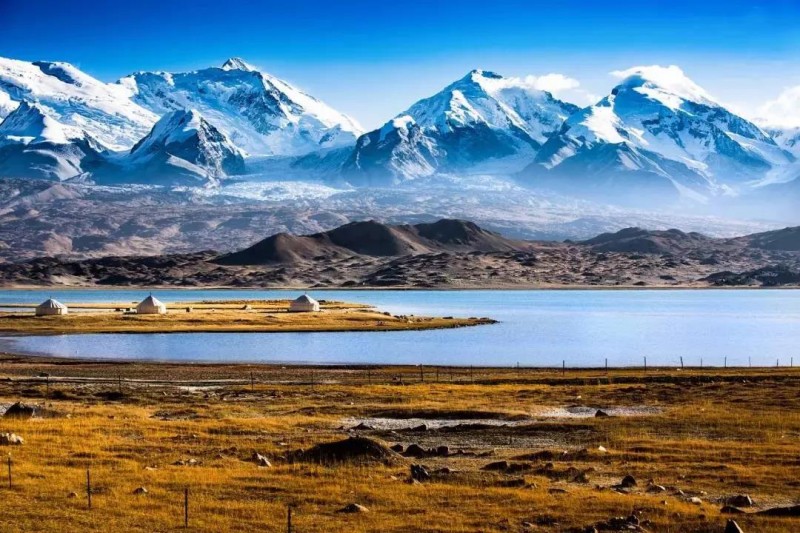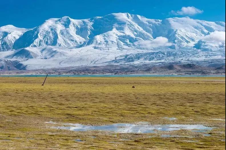 卡拉庫里湖被“昆侖三雄”冰峰環抱,安靜地匍匐在冰山之父慕士塔格峰的山腳下,湖畔水草豐美,常有柯爾克孜牧民在此喂馬、牧羊。