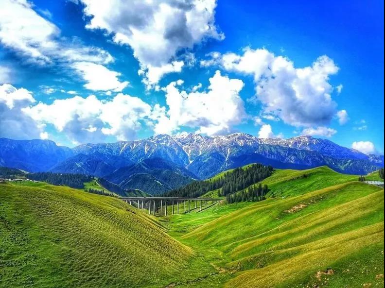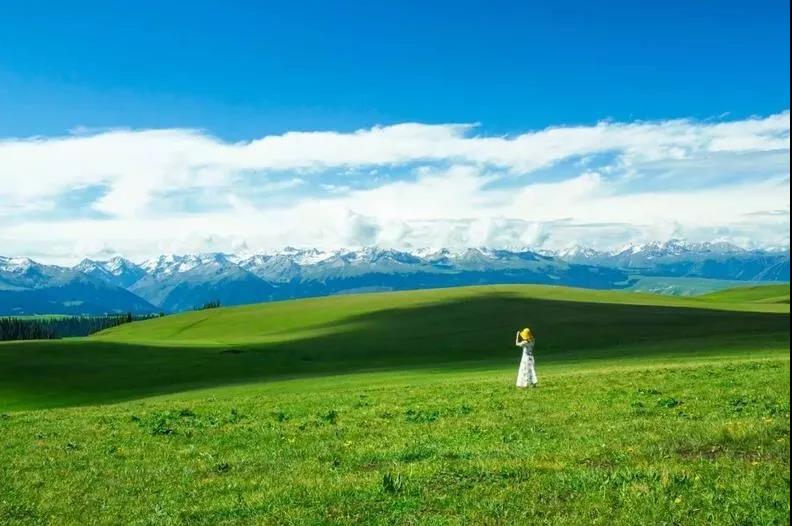 起伏不斷的山坡草地有樹林、花海點綴,猶如一幅舒展的碧色地毯,一直鋪展到皚皚冰雪的高山腳下。濕潤的空氣中彌漫著淡淡的青草香,美得讓人窒息,來到這里,就來到了夢中的天堂。