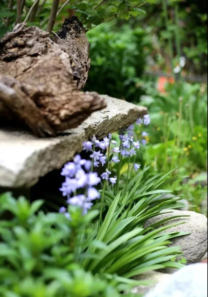 石凳前可愛(ài)的藍(lán)鈴花。