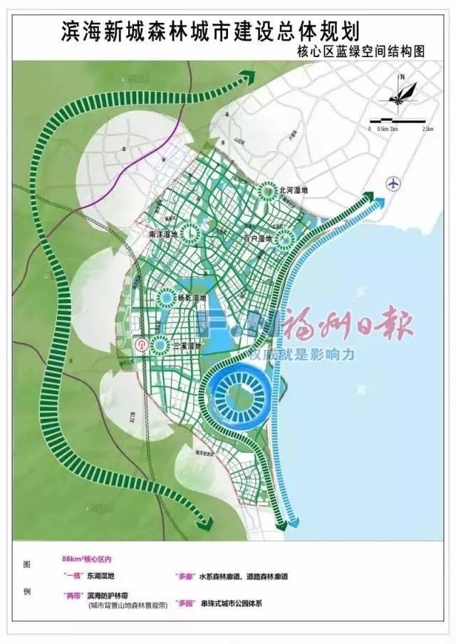 規劃提出,依據福州濱海新城發展定位和自然山水形態,綜合考慮城市發展格局、環境質量狀況、生態敏感區分布和社會文化等需求,統籌考慮新城森林城市建設總體布局框架,形成以“一核兩帶,多廊多園”為骨架的森林城市建設格局。