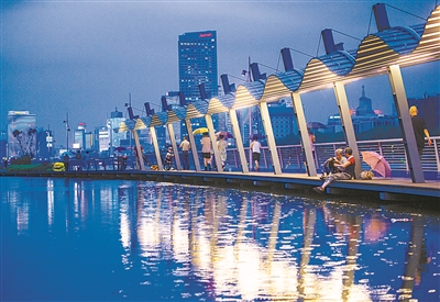 除了夜間景觀打造,槐樹路市政綠化改造的部分設計也十分人性化。改造后的濱江游步道分成自行車道、濱江步道和綠化帶三道,“通車、通行、通綠化”的三通理念應用得淋漓盡致。項目新增綠化約2萬平方米,更新廣場鋪裝近2萬平方米,同時進行了人行道鋪設、景觀小品提升及其他配套工程,如綠化帶上加設、加固了部分無障礙通道功能、非機動車停放區域和便民娛樂設施,以滿足多種不同需要。