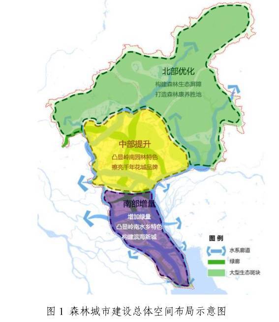根據全市城市森林建設現狀和發展目標要求總體布局和建設思路為:北部優化、中部提升、南部增量。