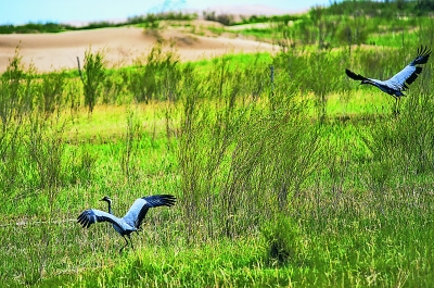 如今的庫布其水肥草美,吸引丹頂鶴翩翩而降。光明圖片
