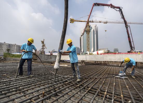 8月25日,施工人員在光谷廣場(chǎng)綜合體主體結(jié)構(gòu)頂部進(jìn)行封頂作業(yè)。新華社記者熊琦攝