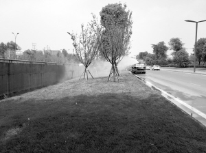該工程4月中旬正式施工,共補栽銀杏50株、香樟5株、晚櫻60株、紫薇78株、西湖海棠269株、樹形三角梅18株。為達到整體綠化效果,打造“最美機場路”,此次栽植的喬木均是由施工人員在溫江、郫都區、都江堰,以及遠赴江蘇、湖南、山東等地逐一篩選而來。“要求樹形優美、分枝點高度一致、全冠幅規格統一。此次栽植的西府海棠就是從山東運回來的。”現場有監督人員分段全程跟蹤栽植過程,對不達標的種植土、草皮責令退場。
