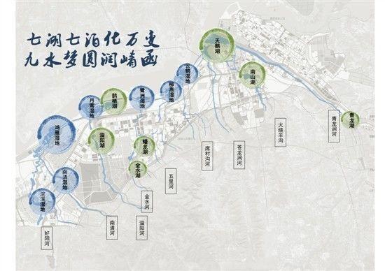 本次規劃對9條水系進行了河道生態綜合治理。青龍澗河治理范圍從山口河入匯口處至天鵝湖國家城市濕地公園,長度12km,規劃在山口河入匯口處新增一處青龍湖,水面面積35萬m2;對湖濱老城區水系進行改造,形成水清景美、水城相融的老城新貌。蒼龍澗河治理范圍從隴海鐵路線至天鵝湖,長度4.2km;火燒羊溝治理范圍從隴海鐵路線至溝口,長度7km,規劃在鄭西高鐵線下新建一處南山湖,水面面積約28萬m2,結合歡樂谷、蒼龍谷、青龍谷打造商務中心區的景觀常水面。好陽河、南清河、淄陽河、金水河、五里河、席村溝等其他河流治理范圍從隴海鐵路線至入黃口,總長度48.32km,規劃新建鵲棲、淄陽、蟠龍、金水4個湖泊,形成水面面積約162萬m2,新建云鶴、柳燕、月鶯、鴻雁、浣溪、南清、鷺洲7個濕地,形成濕地面積約394萬m2。