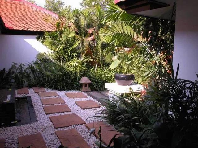 東南亞庭院用的材料也很有代表性,比如黃楊木、青石板、鵝暖石這些親近自然的材料