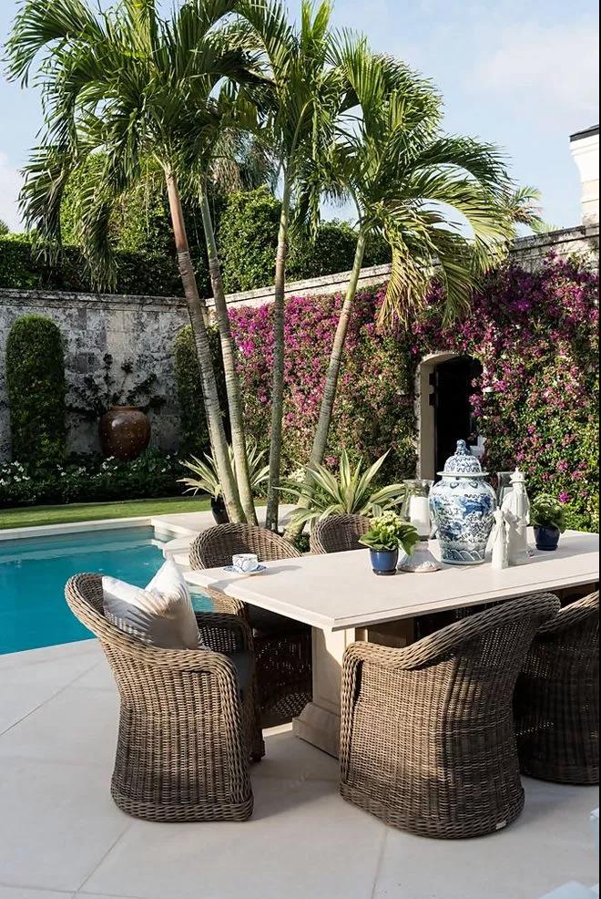 庭院植物主要用高大的棕櫚樹(shù)搭配低矮的灌木叢,常見(jiàn)的植物有椰子樹(shù)、綠蘿、芭蕉樹(shù)、鐵樹(shù)、雞蛋花等等,這些植物的形態(tài)都很有熱帶風(fēng)情