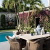庭院植物主要用高大的棕櫚樹搭配低矮的灌木叢,常見的植物有椰子樹、綠蘿、芭蕉樹、鐵樹、雞蛋花等等,這些植物的形態都很有熱帶風情