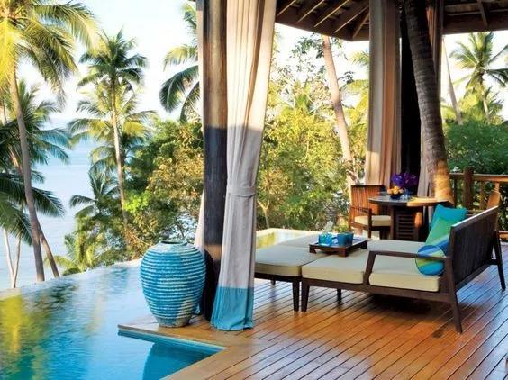 東南亞庭院用的材料也很有代表性,比如黃楊木、青石板、鵝暖石這些親近自然的材料