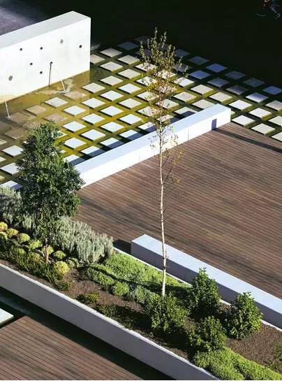 項(xiàng)目是關(guān)于住宅綜合體一層露臺(tái)和三層屋頂花園的景觀設(shè)計(jì),為私家院落。設(shè)計(jì)師將二層的屋頂花園設(shè)計(jì)為自我維護(hù)的花園系統(tǒng),激發(fā)其與周圍環(huán)境的融合,促進(jìn)公共空間的形成。整個(gè)綜合體的布局充滿線性和幾何特征。一層露臺(tái),幾棟建筑物圍合出一個(gè)中央空間。中央空間以石板鋪裝,強(qiáng)調(diào)其與建筑物的聯(lián)系,突顯入口空間,同時(shí)還設(shè)計(jì)了一個(gè)休閑空間,由抬升的種植池和水景小品組成。水景小品以拋光的混凝土墻為中心,富于水體流動(dòng)的光影效果。這面幕墻起到部分保護(hù)中央露臺(tái)花園的作用。三層屋頂花園分割為兩個(gè)功能迥異、相互獨(dú)立卻又相連的空間:南部區(qū)域?yàn)橐粋€(gè)日光浴場(chǎng)所,顯眼地設(shè)置了游泳池;北部區(qū)域?yàn)橐粋€(gè)休閑花園,點(diǎn)綴著游樂(lè)場(chǎng)元素。設(shè)計(jì)的連續(xù)性源自對(duì)場(chǎng)地的透徹理解:概念和功能的流暢貫徹至整個(gè)公共空間和私人空間;步道路網(wǎng)、休閑功能得到了強(qiáng)化;同時(shí)還整合了綠色元素。