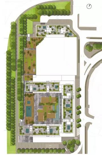 項目是關于住宅綜合體一層露臺和三層屋頂花園的景觀設計,為私家院落。設計師將二層的屋頂花園設計為自我維護的花園系統,激發其與周圍環境的融合,促進公共空間的形成。整個綜合體的布局充滿線性和幾何特征。一層露臺,幾棟建筑物圍合出一個中央空間。中央空間以石板鋪裝,強調其與建筑物的聯系,突顯入口空間,同時還設計了一個休閑空間,由抬升的種植池和水景小品組成。水景小品以拋光的混凝土墻為中心,富于水體流動的光影效果。這面幕墻起到部分保護中央露臺花園的作用。三層屋頂花園分割為兩個功能迥異、相互獨立卻又相連的空間:南部區域為一個日光浴場所,顯眼地設置了游泳池;北部區域為一個休閑花園,點綴著游樂場元素。設計的連續性源自對場地的透徹理解:概念和功能的流暢貫徹至整個公共空間和私人空間;步道路網、休閑功能得到了強化;同時還整合了綠色元素。