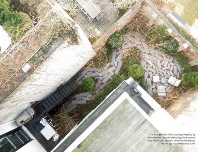 微微曲折的路線營造出漫步森林中的夢幻感覺。其設(shè)計目的是營造置身于一個復(fù)雜的景觀中,帶你遠(yuǎn)離城市的狂熱氛圍。該設(shè)計挑戰(zhàn)了后院作為娛樂和戶外烹飪空間的傳統(tǒng)理念,建造了一個休閑、冥想的空間。其云母片巖鋪設(shè)的道路是木頭漂浮在河流中的狀態(tài)。為了進(jìn)一步增添靜謐感,后院的城市小氣候使該空間比周圍的城市空間要暖些,就種植了山茶花和紫薇花這樣的植物,通常來講這些植物在該區(qū)域很難生存下來。樹冠增添了該空間的隱私性。植物的配置產(chǎn)生層次感和強(qiáng)行透視感,使該空間感覺大些。