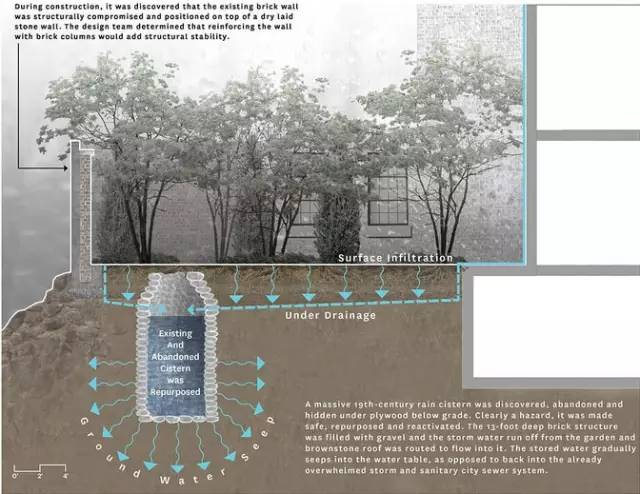 在建造過程中,設計師發現了一個被遺棄的19世紀的蓄水池,并將它重新激活、利用起來。這個4米(13英尺)深的磚結構充滿碎石,而且該花園和褐色砂石屋頂上的所有雨水都流到蓄水池中,慢慢滲透到地下水位——不會進入到專設的、聯合的雨水和衛生系統中。景觀設計師并沒有替換不穩定的磚墻(和建造更多廢物和消費),而是設計立柱保護這個歷史性的元素。這個項目的所有材料都是該區域483千米(300英里)內的自產材料。為了保護水源,設計師安裝了滴灌,取代之前的噴灌。花園中種植了一些樹,在熱天氣為花園和房屋自動降溫,為鳥類建造棲息地。