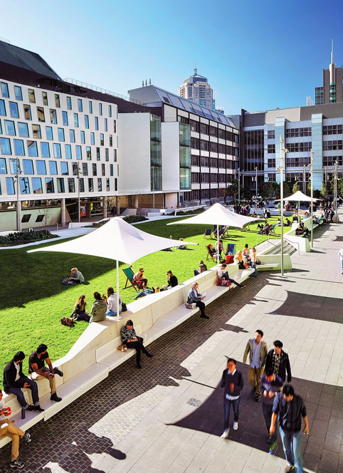 悉尼科技大學校園綠地是悉尼科技大學市中校區最為重要的公共開放空間。校園綠地的規劃是以具有強烈特色的概念設計分析為主導,并體現在規劃和設計過程中所出現的每項設計改動決策之中。為了呼應當年校園總體規劃的遠景:打造出“吸引人停留的校園”,景觀設計工作室將場地劃分為三部分:中心綠地、中心廣場和愜意花園。每個部分的位置選址都經過了精心的安排,全面考慮了場地朝向、光照、流線、場地功能用途及周邊建筑開發計劃情況。