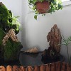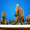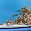 山水盆景是以觀賞巖石為主的一類盆景。制作山水盆景,首先必須進行藝術構思,確定主題,然后按照山石的天然氣質,取其全部或局部適宜造型的石料,并以植物及必要配件進行人工雕琢,配置成假山。將奇峰異巒、高峽飛漾、百嶂千峰、洞幽奇景等自然景色,濃縮到淺盆中,盛在幾案上,儼如一幅立體山水畫,使人如臨碧波綠水之前、名山大川之間,意趣盎然。 分類 水盆型把山石置于淺口水盆中,盆中盛水不盛土. 旱盆型淺盆中有山石而不放水,植物及配件點綴在山石上,但需要保持濕潤. 水旱型淺盆中一部分是土壤、山石、樹木、而另一部分是水。 石料的選擇 制作山水盆景的基本材料主要是山石。我國地大物博,山石的種類繁多,常用的山石約有三十多種,基本上可分為松質和硬質兩大類。松質的吸水性好,容易加工雕琢造型;硬質的則質地堅硬而不吸水,不易加工。不管松質或硬質山石,制作山水盆景的石料必須具有天然紋理、色彩以及形態自然等特點。 (1)砂積石 砂積石呈灰褐色或土黃色,因產地不同,不但色澤有深淺之分,而且質地的松硬程度也有差別。一般來講,砂質石質輕而松,可根據需要,隨心所欲地雕出各種形態的峰、洞、巖以及紋理等,還因其吸水性好,栽種植物易于生長,因此,這種松質石是制作山水盆景最常用的石料之一。但這種石料也有缺點,日子久了容易風化。這種石多產于浙江、安徽、四川、河北、山東等地。 (2)蘆管石 (也稱麥稈石) 蘆管石同砂積石的質地、顏色及產地基本相同。蘆管石有粗有細,有天然形成的管狀小孔和奇峰異洞。選取該石時,應取其自然、完整的部分,稍為加工便可成型。但加工時要特別小心,否則蘆管斷裂便影響自然美。 (3)浮石 浮石是玄武巖的一種,由火山噴發的巖漿冷凝而成,顏色有灰、灰黃、灰白等色,質地疏松,內部有較均勻的小孔,能浮于水面,吸水性好,用小刀可隨意雕刻出各種形態。此石產于東北的吉林長白山以及黑龍江等地。 (4)海母石 海母石是一種貝殼類的沖積化石,因多產于海水中,含有較多的鹽份,需要用清水浸洗一段較長的時間,去其鹽份,才可附植小草木。該石質地疏松,便于改造,吸水性也好。這種石多產于海濱。 (5)鐘乳石 鐘乳石多產于廣東、廣西等各地巖洞,多為白色或微黃色,經過長期自然巖溶而形成柱狀、錐狀等各種形狀,質地較疏松,鋸截較方便。 (6)英石 英石盛產于廣東英德一帶。據《韶州府志》描述:“英石如芙蓉亂削,乳竇交通,p54巖勾漏,無不奇巧玲瓏”。其顏色以灰黑色為多,間有白色、淺綠色和帶白紋理的雜色。有天然形成的正背石,背石較平坦,正面紋理自然,富于變化。質地堅硬,不吸水,不易破碎,但加工較困難。在選擇英石時,以崢嶸、多孔、嶙峋,天然形成的為最佳。 (7)靈壁石 靈壁石質地堅硬,叩之有金屬聲,有黑色、白色,其中也夾雜有黑、白、赭、綠等色,俗稱五彩,多產于安徽省的靈壁縣。 (8)蠟石 蠟石無整體的巖層,多以獨石存于山中。在我國南方各式各地高溫多濕的山坑里,經常被水沖擊,形成各種形態,質地堅硬,不能加工造型,只能以獨石擺設。色有深黃、淺黃、白等。全石以無損壞、無雜質、表面滑凈而有光澤及以竇穴奇形怪狀的為珍品。 (9)斧劈石 斧劈石質硬而脆,顏色有多種,有深灰、淺灰、灰黑色和土黃色等。這種石具有絲狀或片狀的紋理。順其紋理,略施斧鑿或鋸截,加工整形,可表現懸崖峭壁或高聳入云、雄偉挺拔的山峰。此石產于江蘇一帶。 (10)木化石 木化石即古代樹木的化石,質地堅硬,加工較困難。顏色有黃褐色和深灰色。它是制作石山盆景的良好石料。 除上述常用的石料外,還有其他巖石,如產于廣東花縣的菊花石、芙蓉石,肇慶的端石和白星巖石,浙江的松皮石、石筍,四川的龜紋石、雞骨石等等,也可作山水盆景的材料。 石山的布局 山水盆景是運用移天縮地、以小見大的藝術手法,根據“一峰則太華千尋,一勺則江湖萬里”的原則來造型和布局的。山水盆景以山為主,成功的石山必須是既具形態美和雄偉的山勢,又有皺、瘦、透、漏之妙。“皺”就是要求石上表面有紋理,皺褶得有規律,不宜平滑;“瘦”就是要求石塊稍長,頂端較寬有棱角,不宜臃腫;“透”就是指石塊里面有大小孔道,互相溝通;“漏”是指石料要有孔隙,能夠通氣排水。我們在選擇石料制作盆景時,主要是要根據石的特點來確定主題。如修直挺拔、呈懸崖峭壁的,可用來制作險峰;呈扁長形狀的,可用來表現連綿不斷的山巒;皺、瘦、透、漏皆備的,不但可作云峰、洲島、土山,還可作獨石欣賞。如何充分利用石的自然形態進行布局、組拼安排,有下面三種方法可供參考。 ①獨石。獨石俗稱孤峰,在盆內的左邊或右邊安置一塊較大的石峰,另一側放置一兩塊小石作島嶼,這樣大山、小島大小懸殊,各在其位,形成一峰異起于遼闊水面上的景致,此景蘊含深遠,主題集中。這種石料以不用人工加工而自然形成的獨石為佳。 ②子母石。在盆內設置兩塊一大一小的石峰,左右對峙,母石(主峰)突出,略偏于盆的任意一方,但不能立于盆的中央,這樣母石在主位,子石作陪襯,子、母石高矮不一,大小各異,賓主分明。兩石隔水相望,遙相呼應,既對立又統一,既簡練又符合天然山水的真實性。 ③群石。這種石山狀如“眾如拱伏,主山始尊”。盆內山幾座較大的石山組成,群石中的主山必須擺設在重要的位置上,其