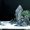 山水盆景是以觀賞巖石為主的一類盆景。制作山水盆景,首先必須進行藝術(shù)構(gòu)思,確定主題,然后按照山石的天然氣質(zhì),取其全部或局部適宜造型的石料,并以植物及必要配件進行人工雕琢,配置成假山。將奇峰異巒、高峽飛漾、百嶂千峰、洞幽奇景等自然景色,濃縮到淺盆中,盛在幾案上,儼如一幅立體山水畫,使人如臨碧波綠水之前、名山大川之間,意趣盎然。 分類 水盆型把山石置于淺口水盆中,盆中盛水不盛土. 旱盆型淺盆中有山石而不放水,植物及配件點綴在山石上,但需要保持濕潤. 水旱型淺盆中一部分是土壤、山石、樹木、而另一部分是水。 石料的選擇 制作山水盆景的基本材料主要是山石。我國地大物博,山石的種類繁多,常用的山石約有三十多種,基本上可分為松質(zhì)和硬質(zhì)兩大類。松質(zhì)的吸水性好,容易加工雕琢造型;硬質(zhì)的則質(zhì)地堅硬而不吸水,不易加工。不管松質(zhì)或硬質(zhì)山石,制作山水盆景的石料必須具有天然紋理、色彩以及形態(tài)自然等特點。 (1)砂積石 砂積石呈灰褐色或土黃色,因產(chǎn)地不同,不但色澤有深淺之分,而且質(zhì)地的松硬程度也有差別。一般來講,砂質(zhì)石質(zhì)輕而松,可根據(jù)需要,隨心所欲地雕出各種形態(tài)的峰、洞、巖以及紋理等,還因其吸水性好,栽種植物易于生長,因此,這種松質(zhì)石是制作山水盆景最常用的石料之一。但這種石料也有缺點,日子久了容易風(fēng)化。這種石多產(chǎn)于浙江、安徽、四川、河北、山東等地。 (2)蘆管石 (也稱麥稈石) 蘆管石同砂積石的質(zhì)地、顏色及產(chǎn)地基本相同。蘆管石有粗有細,有天然形成的管狀小孔和奇峰異洞。選取該石時,應(yīng)取其自然、完整的部分,稍為加工便可成型。但加工時要特別小心,否則蘆管斷裂便影響自然美。 (3)浮石 浮石是玄武巖的一種,由火山噴發(fā)的巖漿冷凝而成,顏色有灰、灰黃、灰白等色,質(zhì)地疏松,內(nèi)部有較均勻的小孔,能浮于水面,吸水性好,用小刀可隨意雕刻出各種形態(tài)。此石產(chǎn)于東北的吉林長白山以及黑龍江等地。 (4)海母石 海母石是一種貝殼類的沖積化石,因多產(chǎn)于海水中,含有較多的鹽份,需要用清水浸洗一段較長的時間,去其鹽份,才可附植小草木。該石質(zhì)地疏松,便于改造,吸水性也好。這種石多產(chǎn)于海濱。 (5)鐘乳石 鐘乳石多產(chǎn)于廣東、廣西等各地巖洞,多為白色或微黃色,經(jīng)過長期自然巖溶而形成柱狀、錐狀等各種形狀,質(zhì)地較疏松,鋸截較方便。 (6)英石 英石盛產(chǎn)于廣東英德一帶。據(jù)《韶州府志》描述:“英石如芙蓉亂削,乳竇交通,p54巖勾漏,無不奇巧玲瓏”。其顏色以灰黑色為多,間有白色、淺綠色和帶白紋理的雜色。有天然形成的正背石,背石較平坦,正面紋理自然,富于變化。質(zhì)地堅硬,不吸水,不易破碎,但加工較困難。在選擇英石時,以崢嶸、多孔、嶙峋,天然形成的為最佳。 (7)靈壁石 靈壁石質(zhì)地堅硬,叩之有金屬聲,有黑色、白色,其中也夾雜有黑、白、赭、綠等色,俗稱五彩,多產(chǎn)于安徽省的靈壁縣。 (8)蠟石 蠟石無整體的巖層,多以獨石存于山中。在我國南方各式各地高溫多濕的山坑里,經(jīng)常被水沖擊,形成各種形態(tài),質(zhì)地堅硬,不能加工造型,只能以獨石擺設(shè)。色有深黃、淺黃、白等。全石以無損壞、無雜質(zhì)、表面滑凈而有光澤及以竇穴奇形怪狀的為珍品。 (9)斧劈石 斧劈石質(zhì)硬而脆,顏色有多種,有深灰、淺灰、灰黑色和土黃色等。這種石具有絲狀或片狀的紋理。順其紋理,略施斧鑿或鋸截,加工整形,可表現(xiàn)懸崖峭壁或高聳入云、雄偉挺拔的山峰。此石產(chǎn)于江蘇一帶。 (10)木化石 木化石即古代樹木的化石,質(zhì)地堅硬,加工較困難。顏色有黃褐色和深灰色。它是制作石山盆景的良好石料。 除上述常用的石料外,還有其他巖石,如產(chǎn)于廣東花縣的菊花石、芙蓉石,肇慶的端石和白星巖石,浙江的松皮石、石筍,四川的龜紋石、雞骨石等等,也可作山水盆景的材料。 石山的布局 山水盆景是運用移天縮地、以小見大的藝術(shù)手法,根據(jù)“一峰則太華千尋,一勺則江湖萬里”的原則來造型和布局的。山水盆景以山為主,成功的石山必須是既具形態(tài)美和雄偉的山勢,又有皺、瘦、透、漏之妙。“皺”就是要求石上表面有紋理,皺褶得有規(guī)律,不宜平滑;“瘦”就是要求石塊稍長,頂端較寬有棱角,不宜臃腫;“透”就是指石塊里面有大小孔道,互相溝通;“漏”是指石料要有孔隙,能夠通氣排水。我們在選擇石料制作盆景時,主要是要根據(jù)石的特點來確定主題。如修直挺拔、呈懸崖峭壁的,可用來制作險峰;呈扁長形狀的,可用來表現(xiàn)連綿不斷的山巒;皺、瘦、透、漏皆備的,不但可作云峰、洲島、土山,還可作獨石欣賞。如何充分利用石的自然形態(tài)進行布局、組拼安排,有下面三種方法可供參考。 ①獨石。獨石俗稱孤峰,在盆內(nèi)的左邊或右邊安置一塊較大的石峰,另一側(cè)放置一兩塊小石作島嶼,這樣大山、小島大小懸殊,各在其位,形成一峰異起于遼闊水面上的景致,此景蘊含深遠,主題集中。這種石料以不用人工加工而自然形成的獨石為佳。 ②子母石。在盆內(nèi)設(shè)置兩塊一大一小的石峰,左右對峙,母石(主峰)突出,略偏于盆的任意一方,