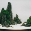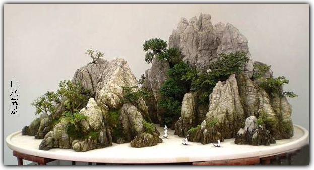 山水盆景是以觀賞巖石為主的一類盆景。制作山水盆景,首先必須進行藝術構思,確定主題,然后按照山石的天然氣質(zhì),取其全部或局部適宜造型的石料,并以植物及必要配件進行人工雕琢,配置成假山。將奇峰異巒、高峽飛漾、百嶂千峰、洞幽奇景等自然景色,濃縮到淺盆中,盛在幾案上,儼如一幅立體山水畫,使人如臨碧波綠水之前、名山大川之間,意趣盎然。 分類 水盆型把山石置于淺口水盆中,盆中盛水不盛土. 旱盆型淺盆中有山石而不放水,植物及配件點綴在山石上,但需要保持濕潤. 水旱型淺盆中一部分是土壤、山石、樹木、而另一部分是水。 石料的選擇 制作山水盆景的基本材料主要是山石。我國地大物博,山石的種類繁多,常用的山石約有三十多種,基本上可分為松質(zhì)和硬質(zhì)兩大類。松質(zhì)的吸水性好,容易加工雕琢造型;硬質(zhì)的則質(zhì)地堅硬而不吸水,不易加工。不管松質(zhì)或硬質(zhì)山石,制作山水盆景的石料必須具有天然紋理、色彩以及形態(tài)自然等特點。 (1)砂積石 砂積石呈灰褐色或土黃色,因產(chǎn)地不同,不但色澤有深淺之分,而且質(zhì)地的松硬程度也有差別。一般來講,砂質(zhì)石質(zhì)輕而松,可根據(jù)需要,隨心所欲地雕出各種形態(tài)的峰、洞、巖以及紋理等,還因其吸水性好,栽種植物易于生長,因此,這種松質(zhì)石是制作山水盆景最常用的石料之一。但這種石料也有缺點,日子久了容易風化。這種石多產(chǎn)于浙江、安徽、四川、河北、山東等地。 (2)蘆管石 (也稱麥稈石) 蘆管石同砂積石的質(zhì)地、顏色及產(chǎn)地基本相同。蘆管石有粗有細,有天然形成的管狀小孔和奇峰異洞。選取該石時,應取其自然、完整的部分,稍為加工便可成型。但加工時要特別小心,否則蘆管斷裂便影響自然美。 (3)浮石 浮石是玄武巖的一種,由火山噴發(fā)的巖漿冷凝而成,顏色有灰、灰黃、灰白等色,質(zhì)地疏松,內(nèi)部有較均勻的小孔,能浮于水面,吸水性好,用小刀可隨意雕刻出各種形態(tài)。此石產(chǎn)于東北的吉林長白山以及黑龍江等地。 (4)海母石 海母石是一種貝殼類的沖積化石,因多產(chǎn)于海水中,含有較多的鹽份,需要用清水浸洗一段較長的時間,去其鹽份,才可附植小草木。該石質(zhì)地疏松,便于改造,吸水性也好。這種石多產(chǎn)于海濱。 (5)鐘乳石 鐘乳石多產(chǎn)于廣東、廣西等各地巖洞,多為白色或微黃色,經(jīng)過長期自然巖溶而形成柱狀、錐狀等各種形狀,質(zhì)地較疏松,鋸截較方便。 (6)英石 英石盛產(chǎn)于廣東英德一帶。據(jù)《韶州府志》描述:“英石如芙蓉亂削,乳竇交通,p54巖勾漏,無不奇巧玲瓏”。其顏色以灰黑色為多,間有白色、淺綠色和帶白紋理的雜色。有天然形成的正背石,背石較平坦,正面紋理自然,富于變化。質(zhì)地堅硬,不吸水,不易破碎,但加工較困難。在選擇英石時,以崢嶸、多孔、嶙峋,天然形成的為最佳。 (7)靈壁石 靈壁石質(zhì)地堅硬,叩之有金屬聲,有黑色、白色,其中也夾雜有黑、白、赭、綠等色,俗稱五彩,多產(chǎn)于安徽省的靈壁縣。 (8)蠟石 蠟石無整體的巖層,多以獨石存于山中。在我國南方各式各地高溫多濕的山坑里,經(jīng)常被水沖擊,形成各種形態(tài),質(zhì)地堅硬,不能加工造型,只能以獨石擺設。色有深黃、淺黃、白等。全石以無損壞、無雜質(zhì)、表面滑凈而有光澤及以竇穴奇形怪狀的為珍品。 (9)斧劈石 斧劈石質(zhì)硬而脆,顏色有多種,有深灰、淺灰、灰黑色和土黃色等。這種石具有絲狀或片狀的紋理。順其紋理,略施斧鑿或鋸截,加工整形,可表現(xiàn)懸崖峭壁或高聳入云、雄偉挺拔的山峰。此石產(chǎn)于江蘇一帶。 (10)木化石 木化石即古代樹木的化石,質(zhì)地堅硬,加工較困難。顏色有黃褐色和深灰色。它是制作石山盆景的良好石料。 除上述常用的石料外,還有其他巖石,如產(chǎn)于廣東花縣的菊花石、芙蓉石,肇慶的端石和白星巖石,浙江的松皮石、石筍,四川的龜紋石、雞骨石等等,也可作山水盆景的材料。 石山的布局 山水盆景是運用移天縮地、以小見大的藝術手法,根據(jù)“一峰則太華千尋,一勺則江湖萬里”的原則來造型和布局的。山水盆景以山為主,成功的石山必須是既具形態(tài)美和雄偉的山勢,又有皺、瘦、透、漏之妙。“皺”就是要求石上表面有紋理,皺褶得有規(guī)律,不宜平滑;“瘦”就是要求石塊稍長,頂端較寬有棱角,不宜臃腫;“透”就是指石塊里面有大小孔道,互相溝通;“漏”是指石料要有孔隙,能夠通氣排水。我們在選擇石料制作盆景時,主要是要根據(jù)石的特點來確定主題。如修直挺拔、呈懸崖峭壁的,可用來制作險峰;呈扁長形狀的,可用來表現(xiàn)連綿不斷的山巒;皺、瘦、透、漏皆備的,不但可作云峰、洲島、土山,還可作獨石欣賞。如何充分利用石的自然形態(tài)進行布局、組拼安排,有下面三種方法可供參考。 ①獨石。獨石俗稱孤峰,在盆內(nèi)的左邊或右邊安置一塊較大的石峰,另一側(cè)放置一兩塊小石作島嶼,這樣大山、小島大小懸殊,各在其位,形成一峰異起于遼闊水面上的景致,此景蘊含深遠,主題集中。這種石料以不用人工加工而自然形成的獨石為佳。 ②子母石。在盆內(nèi)設置兩塊一大一小的石峰,左右對峙,母石(主峰)突出,略偏于盆的任意一方,但不能立于盆的中央,這樣母石在