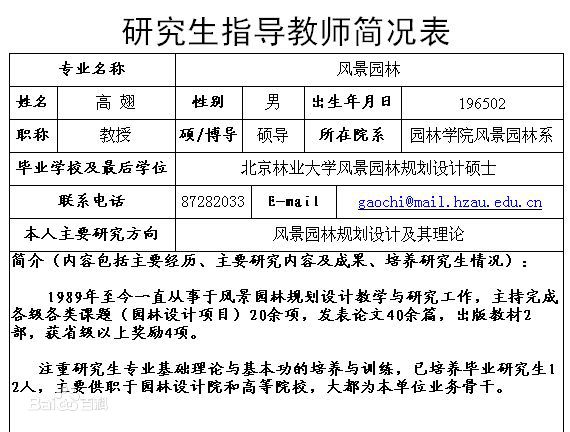 (內容包括主要經歷、主要研究內容及成果、培養研究生情況): 1989年至今一直從事于風景園林規劃設計教學與研究工作,主持完成各級各類課題(園林設計項目)20余項,發表論文40余篇,出版教材2部,獲省級以上獎勵4項。 注重研究生專業基礎理論與基本功的培養與訓練,已培養畢業研究生12人,主要供職于園林設計院和高等院校,大都為本單位業務骨干。