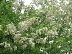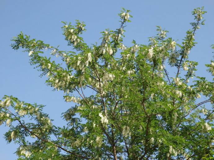 刺槐又名洋槐,原生于北美洲,現被廣泛引種到亞洲、歐洲等地。刺槐樹皮厚,暗色,紋裂多;樹葉根部有一對1-2毫米長的刺;花為白色,有香味,穗狀花序;果實為莢果,每個果莢中有4-10粒種子。刺槐木材堅硬,耐腐蝕,燃燒緩慢,熱值高。刺槐花可食用。