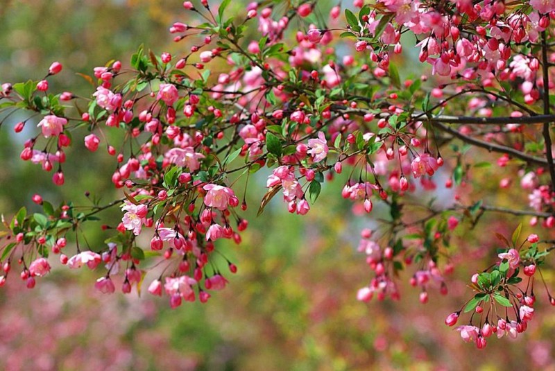 落葉小喬木,枝開張,葉卵形,花5~7朵簇生枝端,鮮紅色,4~5月開放。高可達8米。枝干峭 垂絲海棠