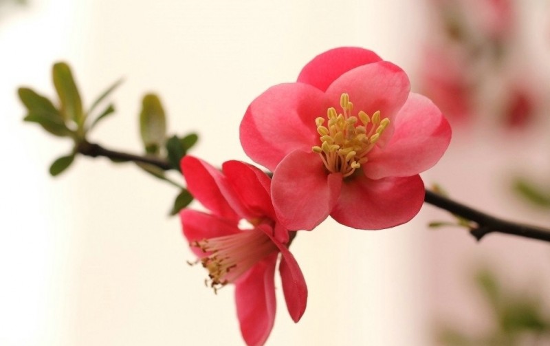貼梗海棠為薔薇科、木瓜屬落葉灌木,高可達2米,花3朵至5朵簇生于2年生老枝上,先葉后花或花葉同放,花色為紅、粉紅及白色,直徑約3厘米至5厘米。果卵形至球形,徑4厘米至6厘米。花期3月至4月,如果光照、濕度條件適宜,1月至2月即可開花,果熟期9月至10月。