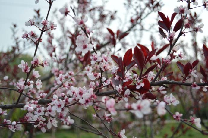 4.紫葉矮櫻花單生,淡粉紅色,花瓣5片,微香,花期4~5月。紫葉李花瓣白色, 長圓形或匙形,邊緣波狀,基部楔形,花期4月。