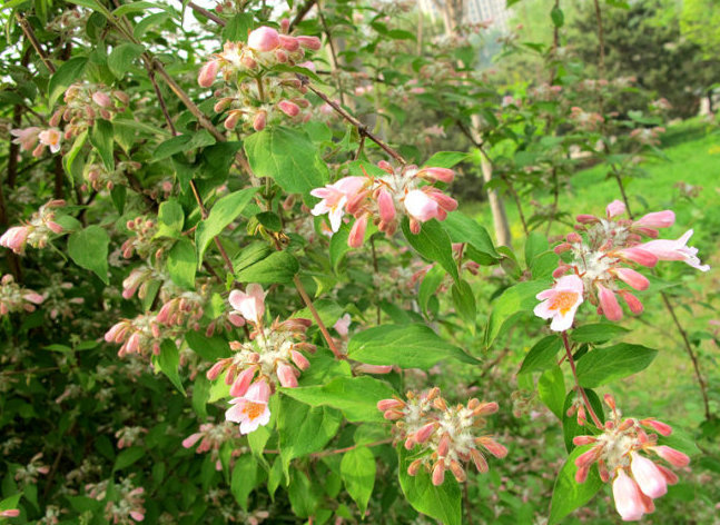 落葉灌木,株高3米,幼枝披柔毛,老枝皮剝落。葉橢圓形至卵狀矩圓形,葉面疏生短柔毛,花期為5—6月。花粉紅至紫紅色,花冠鐘狀。果實(shí)卵形,兩個(gè)合生,其中一個(gè)不發(fā)育,8—9月成熟。