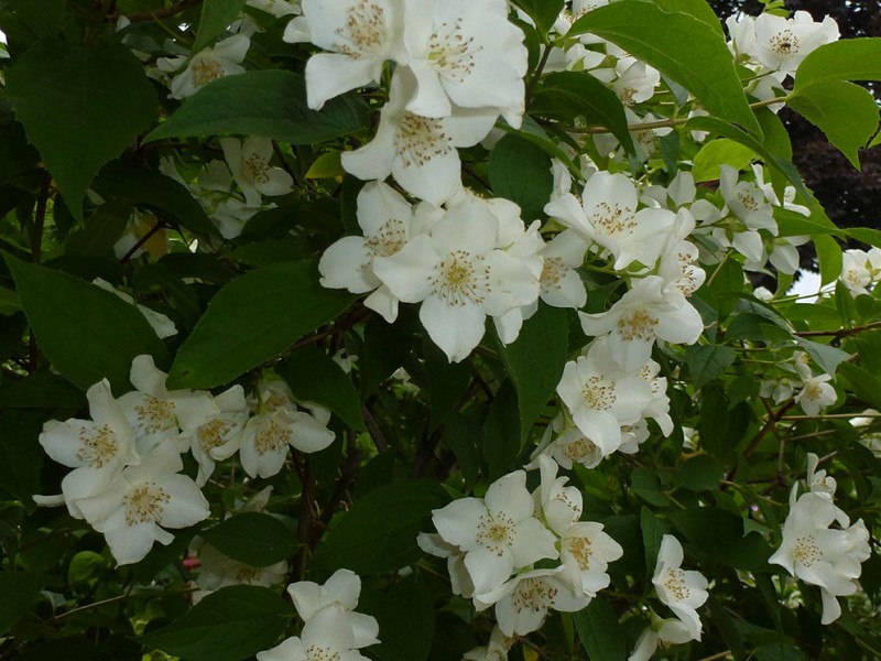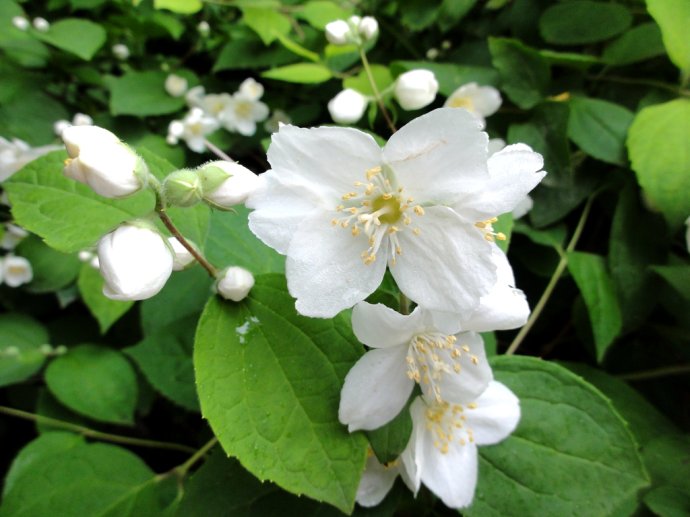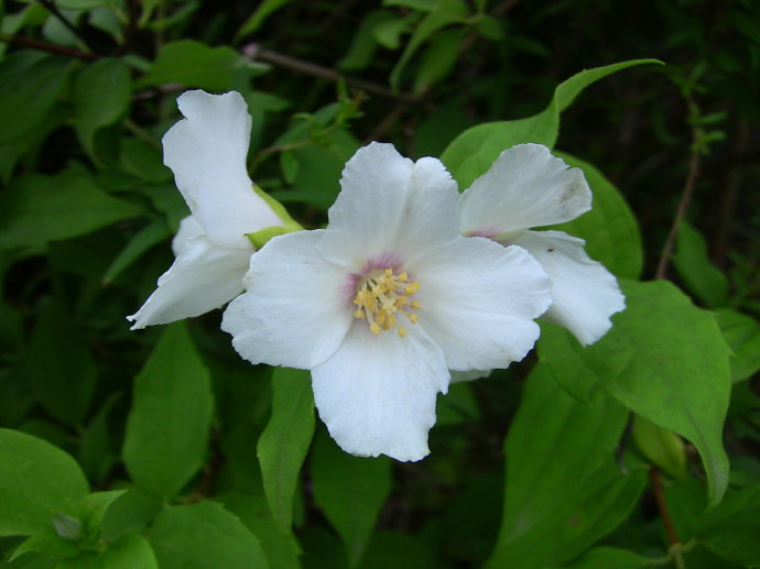 Philadelphus L. 山梅花屬,虎耳草科,約75種,我國約有15種,大部供觀賞用。該屬物種為直立灌木,枝具白髓;單葉對生,基部3~5主脈。花萼 、花瓣各4,雄蕊多數,蒴果4瓣裂。