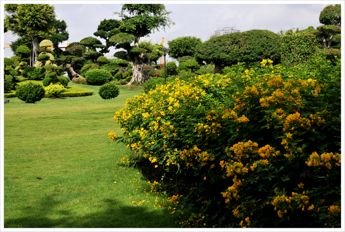 2.花期長,群體效果尤佳。傘房決明在上海地區8—12月開花,盛花期在9—11月,花期近半年之久。金黃色的小花綴滿枝頭,十分繁茂。群栽時一片金黃色,鮮艷奪目。先開的花朵成熟后,一串串細條狀的豆莢掛滿樹梢閃閃發亮,隨風搖曳,另成一景。