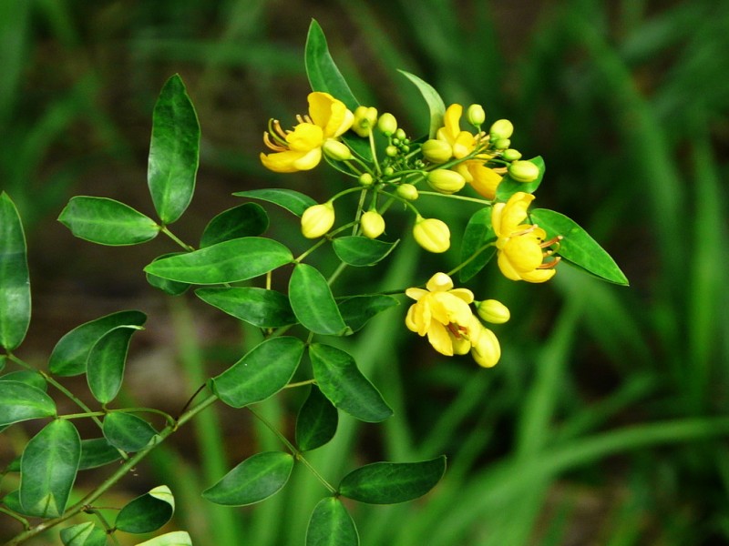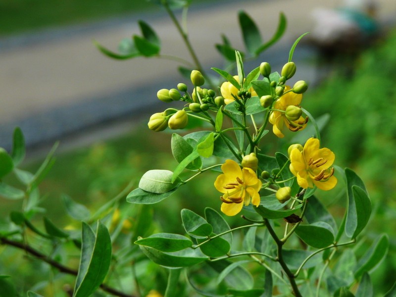 雙莢決明:學名Casin bicapsularis.L,原產于南美,常綠或半常綠花灌木,高達1-3米,羽狀復葉,橢圓形小葉光滑,圓錐花序頂生或腋生,在疏松、排水良好的土壤中生長,肥沃土壤中開花旺盛。