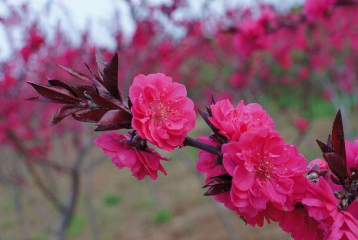 紅葉壽星桃葉子常年紫紅,葉片細長,花朵繁茂,適應性強,耐旱、高溫、低溫和貧瘠,植株色甘表現極好,適合作為盆栽觀賞、作為低矮層的造型樹。桃樹是我國大部分地區園林綠化的重要樹種,經濟市場前景廣闊。