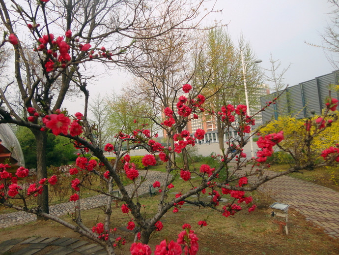 屬于觀賞桃花類的半重瓣及重瓣品種,統稱為碧桃。華東地區碧桃花期是3月~4月,花朵豐腴,色彩鮮艷豐富,花型多。常見的品種有紅花綠葉碧桃、紅花紅葉碧桃,白紅雙色灑金碧桃等多個變種。碧桃具有很高的觀賞價值,在小區、公園、街道隨處可見的美麗植物。