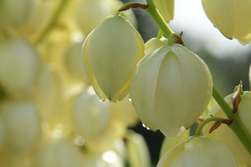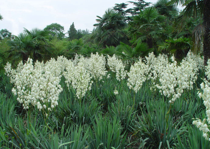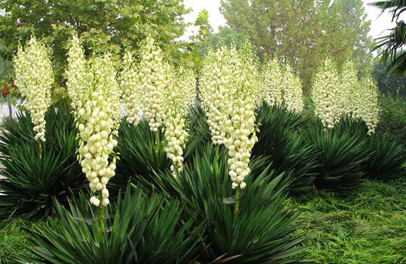 每年夏末秋初的交替季節中,是絲蘭大面積開花的季節,而且白色的絲蘭花會開很久,因為觀賞效果極佳的絲蘭花期很長。絲蘭在開花的時候花莖很短,會有大片的簇生的絲蘭花緊密相連,并且絲蘭花枝是向上高聳綻放的;潔白的絲蘭散發著清幽奇特的花香,而大朵的絲蘭花垂下的姿態如鈴鐺一樣優雅;絲蘭花會在夜間靜靜的開放,然后在讓大家觀賞的同時,吸引更多的花蛾取采花粉,然后間接的完成絲蘭花與生俱來的使命。