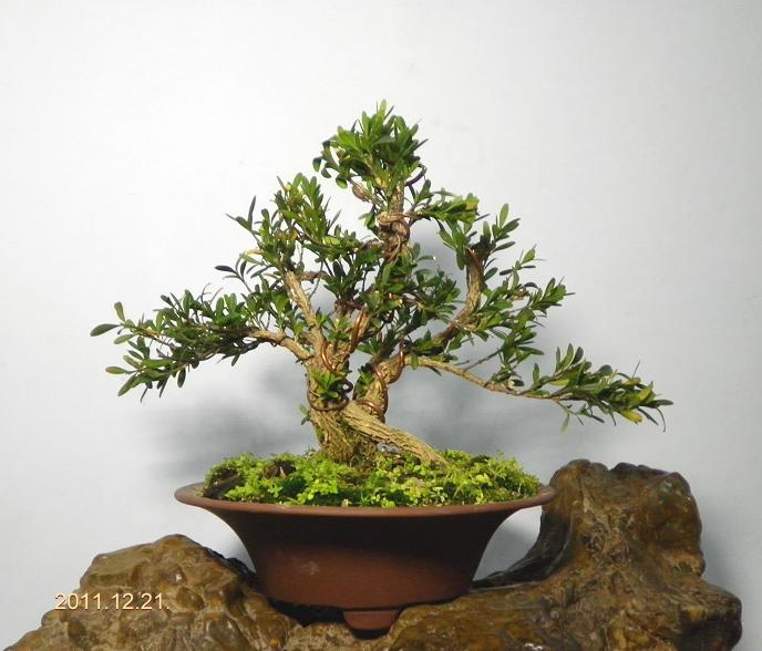 雀舌黃楊盆景主干長勢特慢,非常蒼勁,但嫩枝條長得較快,葉的密度必然拉長,就顯得軟散,惟有用“摘心”來控制,才能保證觀賞價值。就是在枝條沒有木質(zhì)化之前,留一對,最多兩對嫩葉片,其余摘掉或剪掉,在適當(dāng)?shù)乃实葪l件下,十天半月它就會發(fā)出兩個嫩芽來。就這樣周而復(fù)始,它的枝條顯得短而粗,葉片可以2的積數(shù)倍增,不斷提高觀賞價值。再就是要及時摘除花苞。雀舌黃楊在夏秋之前就開始有花苞了,春天開花,花果所需營養(yǎng)要占全樹的70%-80%,這樣必然影響它正常生長和美觀,我們是以觀葉為主。所以必然從見花苞開始,就要把它摘除。