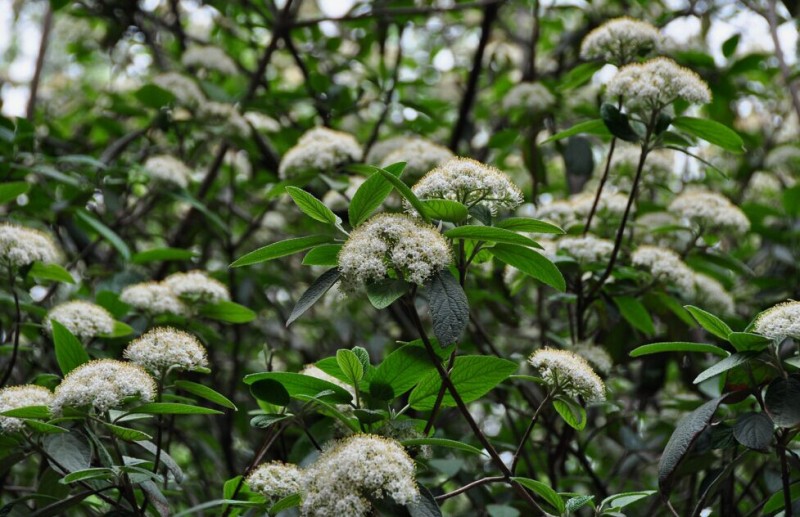 常綠灌木或小喬木,高達4米;幼枝、芽、葉下面、葉柄及花序均被由黃白色、黃褐色或紅褐色簇狀毛組成的厚絨毛,毛的分枝長0.3-0.7毫米;當年小枝粗壯,稍有棱角,二年生小枝紅褐色或灰黑色,無毛,散生圓形小皮孔,老枝黑褐色。葉革質,卵狀矩圓形至卵狀披針形,長8-18 (-25) 厘米,頂端稍尖或略鈍,基部圓形或微心形,全緣或有不明顯小齒,上面深綠色有光澤,幼時疏被簇狀柔毛,后變無毛,各脈深凹陷而呈極度皺紋狀,下面有凸起網紋,側脈6-8 (-12) 對,近緣處互相網結,很少直達齒端;葉柄粗壯,長1.5-3 (-4) 厘米。聚傘花序稠密,直徑7-12厘米,總花梗粗壯,長1.5-4 (-7) 厘米,第一級輻射枝通常7條,四角狀,粗壯,花生于第三級輻射枝上,無柄;萼筒筒狀鐘形,長2-3毫米,被由黃白色簇狀毛組成的絨毛,長2-3毫米,萼齒微小,寬三角狀卵形,長0.5-1毫米;花冠白色,輻狀,直徑5-7毫米,幾無毛,裂片圓卵形,長2-3毫米,略長于筒;雄蕊高出花冠,花藥寬橢圓形,長約1毫米。果實紅色,后變黑色,寬橢圓形,長6-8毫米,無毛;核寬橢圓形,兩端近截形,扁,長6-7毫米,直徑4-5毫米,有2條背溝和3條腹溝?;ㄆ?-5月,果熟期9-10月。