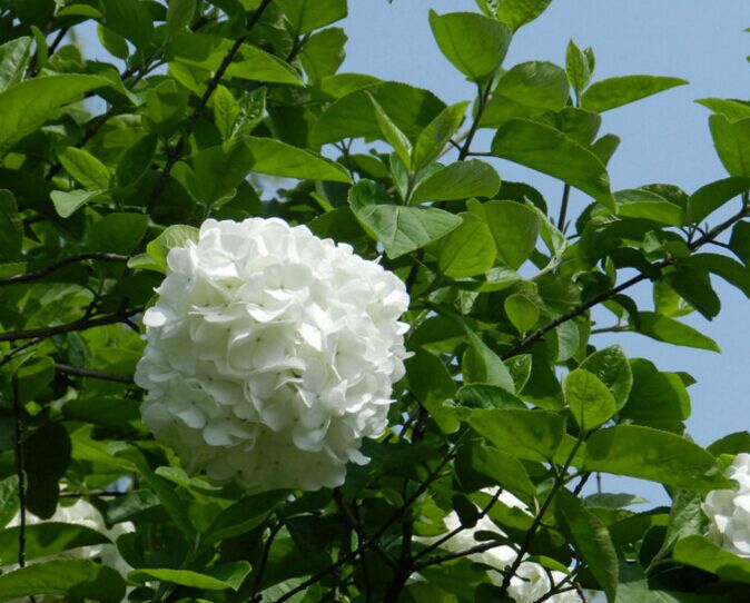 歐洲莢迷,英文名the European snowball,忍冬科,莢蒾屬,落葉大灌木。原產歐洲,華北、東北、西北、華中、華南均可栽培。落葉大灌木,屬繡球狀花歐洲莢迷。高約4~5m。樹枝灰色,小枝有皮孔.葉寬卵形至卵圓形,長6~12cm,通常3裂,裂片邊緣具不規則的齒,掌狀3出脈.繡球狀花序,徑8~12cm,生于側枝頂端,花冠乳白色,;綠葉白花,高雅別致。果期8-12月,核果近球形,徑約1cm,鮮紅色,晶瑩剔透,久掛不落,惹人喜愛,秋葉紅艷、美麗,是集觀花、觀果、觀葉為一體的優良觀賞品種。