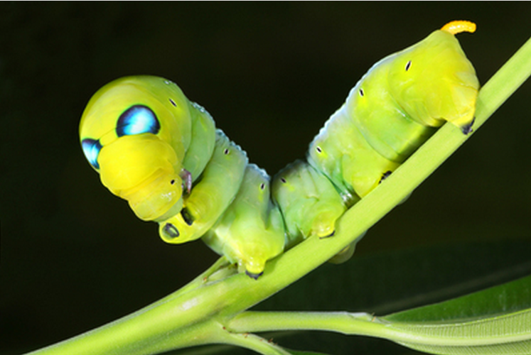 夾竹桃天蛾,卵圓形, 直徑約1.5毫米,幼蟲粗大,胸節有一大型眼狀紋,中間藍色,邊緣黑色,第十一腹節有尾角,老熟幼蟲尾角短而下彎。成蟲橄欖綠,前翅基有小眼紋。幼蟲貪食,吃葉片。成蟲飛翔力極強,已由地中海漫延大半個地球,一年約2-3 代。成蟲夜行性,夜晚有趨光性。